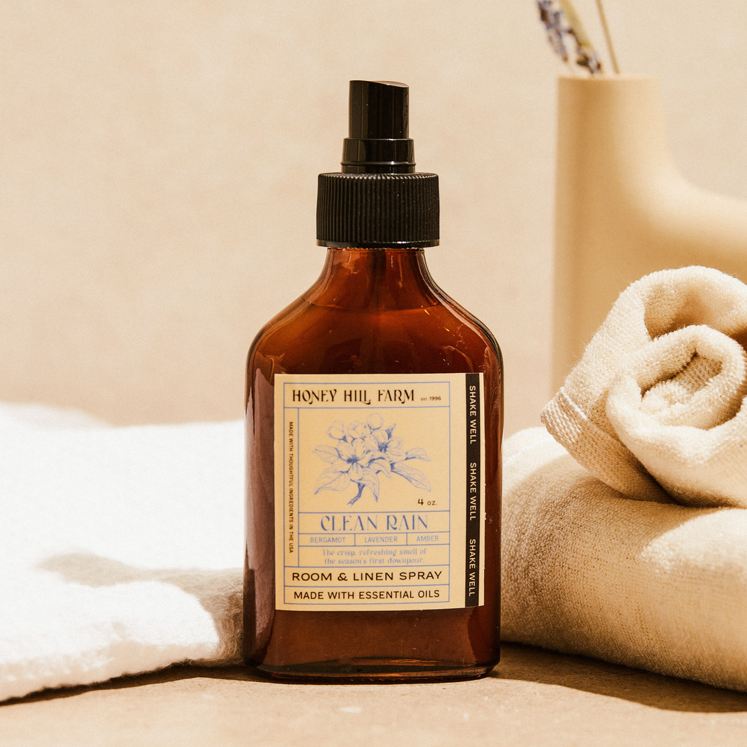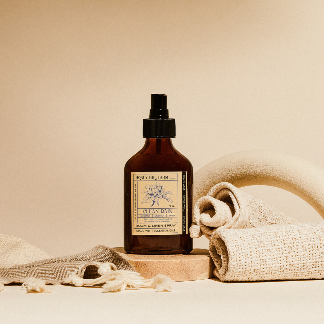 Made with a therapeutic blend of essential oils, this delicate aromatic mist neutralizes stale air and keeps your spaces, bed linens, curtains, and sofa smelling fresh. Room & Linen Mist is packaged in a recyclable, retro glass whiskey bottle with a fine mist sprayer.