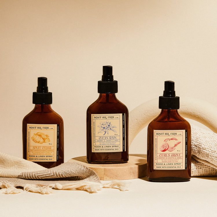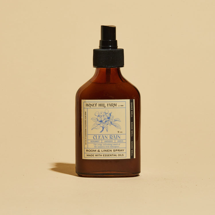 Made with a therapeutic blend of essential oils, this delicate aromatic mist neutralizes stale air and keeps your spaces, bed linens, curtains, and sofa smelling fresh. Room & Linen Mist is packaged in a recyclable, retro glass whiskey bottle with a fine mist sprayer.