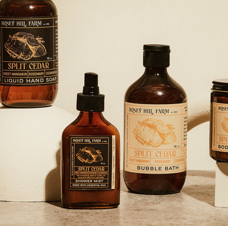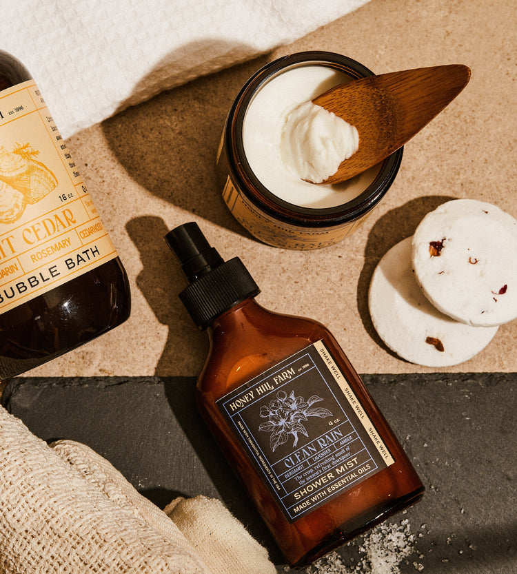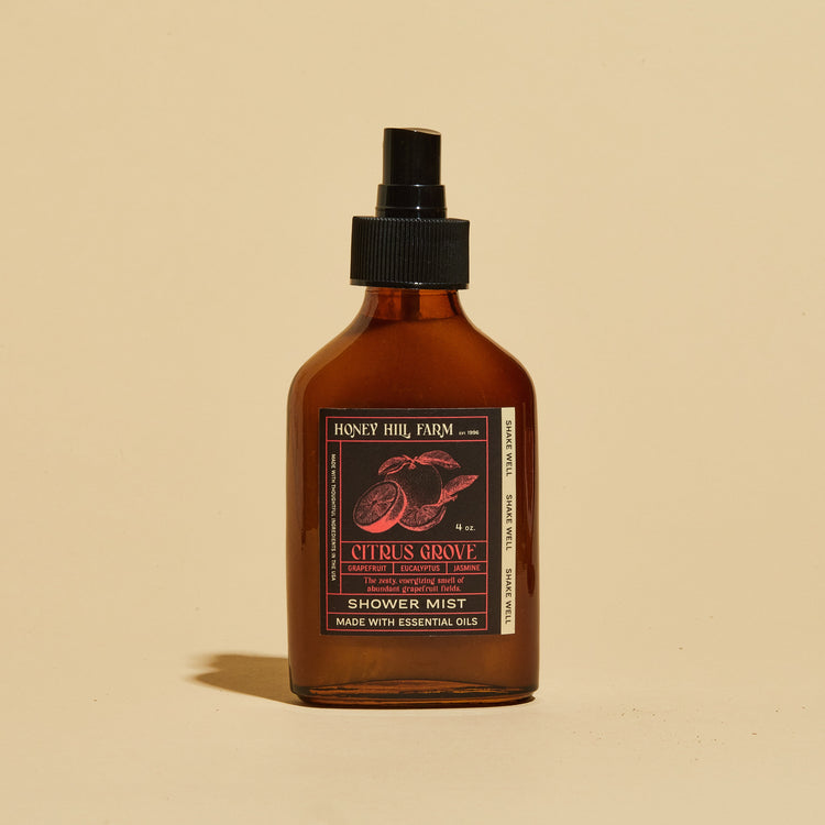 This aromatic mist transforms showers into a spa escape. A blend of essential oils mingle with the shower steam to create a cloud of relaxing, therapeutic scent. Shower Mist is packaged in a recyclable, retro glass whiskey bottle with a fine mist sprayer.